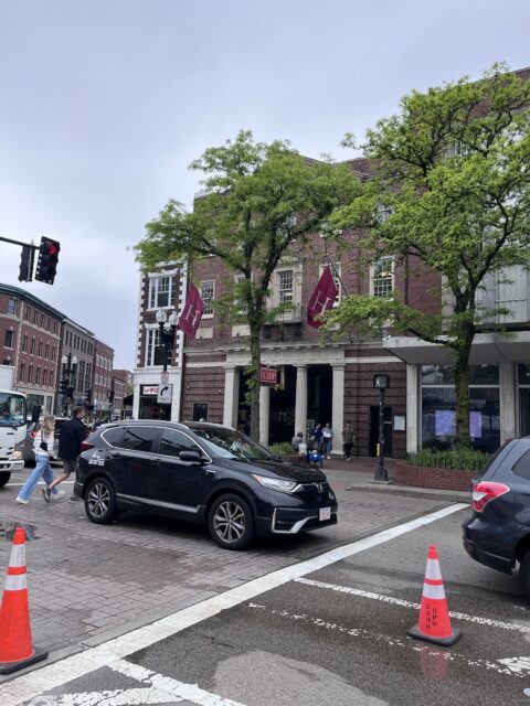 地下鉄で15分もかからないうちにケンブリッジにつきました。地上に上がるとそこにはもうハーバードタウンがあり、一つの大学街を形成していました。写真にあるのは、今回のお目当てでもある大学の生協ブックストア。教科書から各専攻の教授たちが推奨する本がたくさん並べられていました。駅前ではプロテストも行われていて、卒業式も近いことから、非常に緊張感のある雰囲気でした。