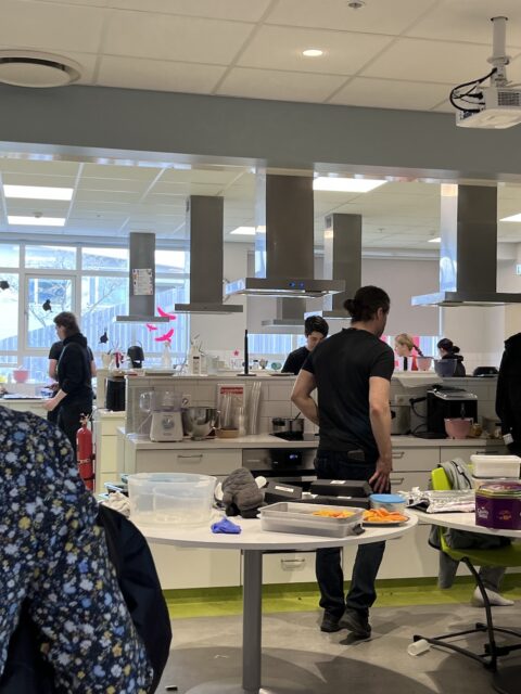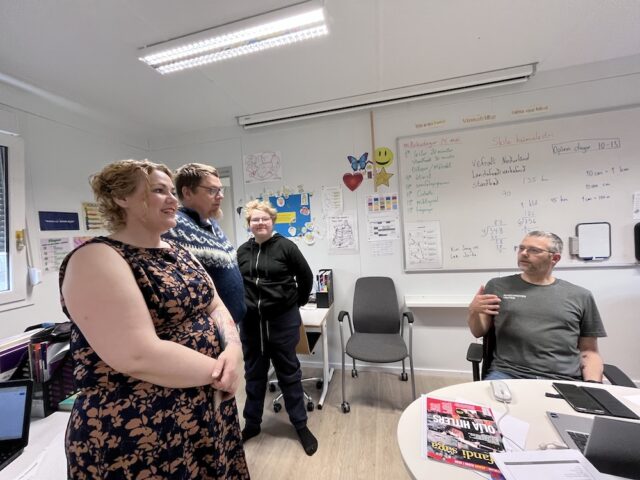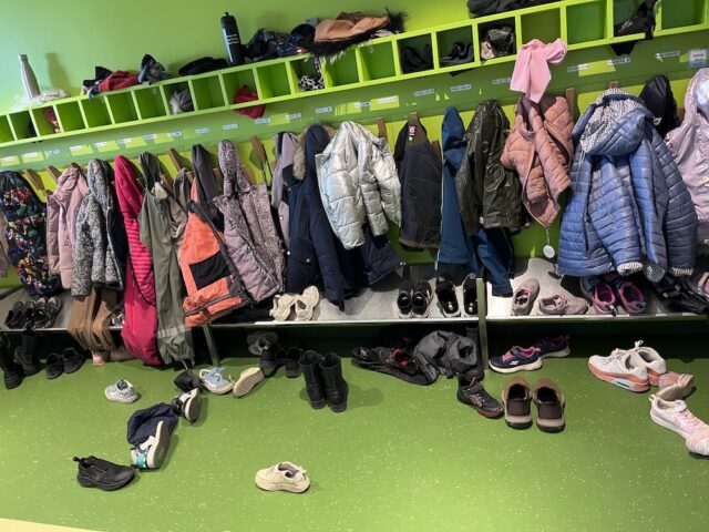 そして、エヴァリンたちが暮らす、ボルガネーズに戻ると、オープンスクールが開催中の子供達の学校にお邪魔しました。アイスランド流の下駄箱エリアでは、みんな靴をこんな感じで脱いでコートとリュックをかけて教室に入ります。ちなみにみんな上履きは履いていませんでした。土足と床に上がる感覚は日本と一緒なのですね。