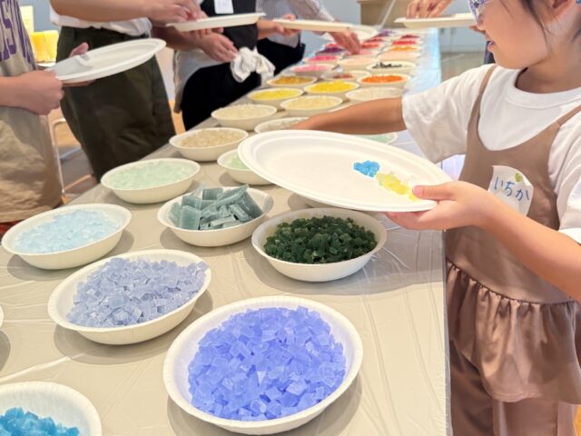 キャンドル作家の米澤純さんと一緒に、みんなの心に見える色を選び、オリジナルキャンドルを作ります。純さんは、キャンドルに心の色を重ね、暮らしの中で温かく心が照らされるような灯りを作っています。