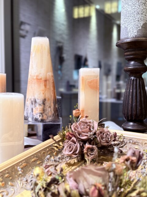 電気を全部消して、しばらくキャンドルの灯りだけで過ごされたようです。ホワイトのキャンドルは明かりを通しやすく、部屋を明るくしてくれる一方で、チャコールグレーの深い色合いのキャンドルは、私たちの内面に入ってきて、その場所を照らしてくれるような印象を持ちました。