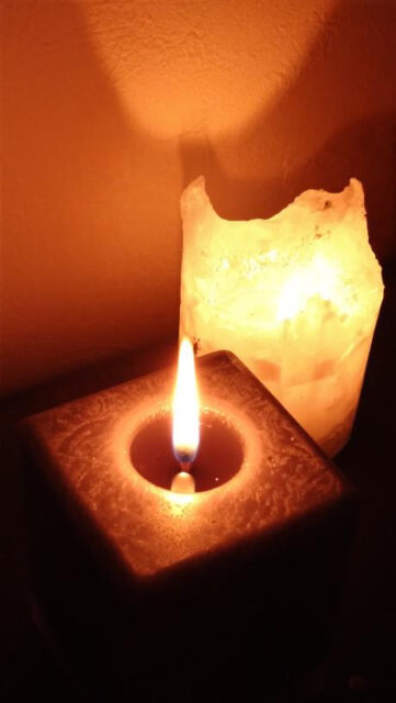 電気を全部消して、しばらくキャンドルの灯りだけで過ごされたようです。ホワイトのキャンドルは明かりを通しやすく、部屋を明るくしてくれる一方で、チャコールグレーの深い色合いのキャンドルは、私たちの内面に入ってきて、その場所を照らしてくれるような印象を持ちました。