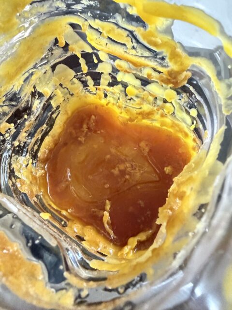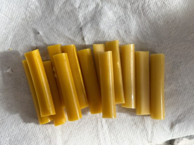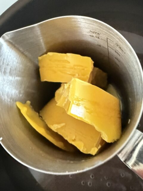 これは2度目の精製を経た蜜蝋。大分不純物も取り除けてきました。