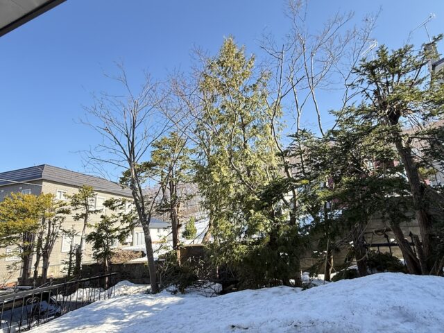 我が家のお庭の雪解けもあと少し。今日は青空の小樽。